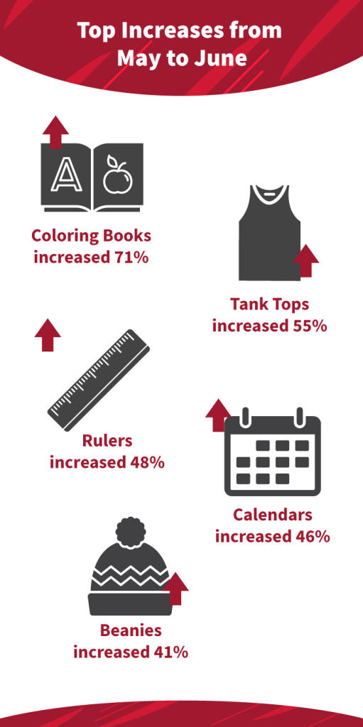 对于我们的最高增幅产品排行,我们看到coloring books(彩绘书)增长了 71%,紧随其后的是tank tops(吊带衫)增长了 55%。 rulers(尺子)和calendars(日历)也有所增加,这绝对预示着即将到来的新学年。